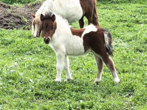 Ein wirklich kleiner Fuchsschecke evtl Roan, Vater Pr.H. Dressman B Mutter unsere Elite Stute Zwietje von de Leedjes.